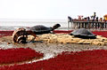 红海滩码头是一处在滩涂上建起的纯木制仿古旅游景观,全长1000余米的两座蜿蜒的九曲廊桥蜿蜒伸入海中,两条“九曲廊桥”自岸边直探进海中,沿着木栈道走走停停,大概半个小时就可以完成,在那么空旷的地方,远眺“红海”蓝天一线相接,心情会象天空的蓝色一样好。红海滩码头还是世界上唯一一处在泥滩上建起的纯木结构的仿古建筑群,妈祖庙和木栈道一样,当然都是为了开发旅游而修建的。在妈祖庙后面的平台的,有几个丹顶鹤——雕塑,主要是为了美化环境和给游人留影用的。站在栈道上远望这由万亩火红的碱蓬草织就的天赐美景,在领略自然美景的同时,再钓几个小蟹子,别有一番情趣。织就红海滩的是一颗颗纤柔的碱蓬草,学名叫翅碱蓬,由于土质的原因,碱蓬草出土的时候就是红色的,随着季节的生长,会越长越红。草底下都是湿泥,有好多好多小蟹子洞。